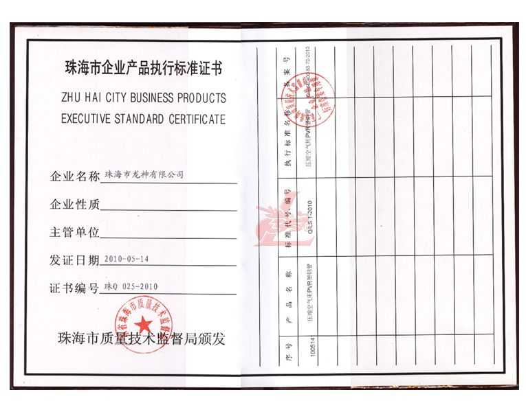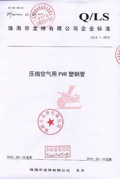 龍神壓縮空氣PVR塑鋼管成功申請企業(yè)執(zhí)行標(biāo)準(zhǔn) 2010年5月珠海市龍神有限公司“壓縮空氣PVR塑鋼管”得到珠海市質(zhì)量技術(shù)監(jiān)督局認(rèn)可,特此頒發(fā)“壓縮空氣PVR塑鋼管企業(yè)執(zhí)行標(biāo)準(zhǔn)”,龍神公司在嚴(yán)格執(zhí)行標(biāo)準(zhǔn)下,保證產(chǎn)品質(zhì)量。 2010-05-20 9649