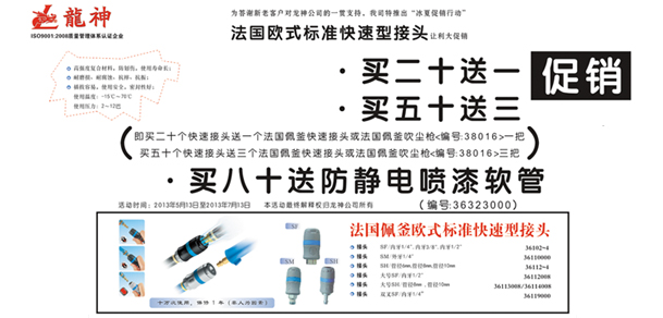 法國佩釜快速接頭“冰夏”讓利大促銷 2013-05-13 18421 法國佩釜快速接頭促銷方案(產(chǎn)品編號:36102000-36119000)一、主題:“冰夏”促銷行動 二、目的:回饋新老客戶,讓利大反饋 三、時間:1、 啟動時間:2013年5月13日 2、 結(jié)束時間:2013年7月13日3、 時長:2個月 四、活動內(nèi)容:1、 買二十送一(即買二十個快速接頭送一個法國佩釜快速接頭或法法國佩釜吹塵槍(編號:38016)一把) 2、 買五十送三 3、 買八十送防靜電噴漆軟管(編號:36323)五、其它 1、本活動最終解釋權(quán)歸珠海龍神所有。